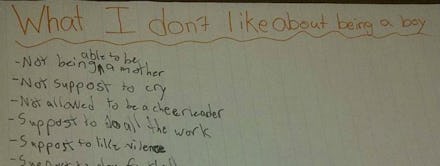 The pressures of manhood don't just affect men; they also affect women. When we don't call gender stereotypes into question, we risk young boys continuing to strive to fit a norm that, as this boy's list reveals, is deeply flawed.