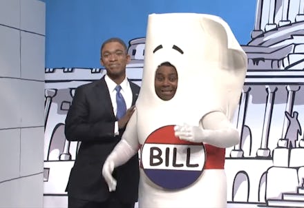 Kenan Thompson, dressed up as a "Bill," explains how he usually passes through Congress. But with the House (and, after the midterms, Senate) under Republican control, it's unlikely that Obama's bill would pass. So, Jay Pharaoh, playing the president, pushes Thompson down the Capitol's steps since that bill is not going to happen under the GOP's purview.