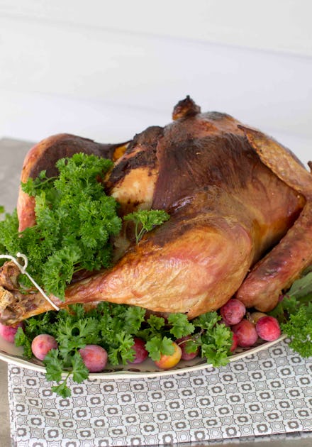 The average bird sold on Thanksgiving is 15 pounds, which breaks down into 70% white meat and 30% dark meat. You're advised to account for three-quarters of a pound for every guest with a bird over 12 pounds, so that equals 12 ounces of bird per person, plus 3 ounces more for seconds. While everyone has their preferences (hands off the dark meat, Cousin Skip) for the purposes of this menu we've gone for a more ecumenical approach, with equal meats from all parts of the bird.