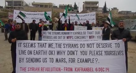 On Saturday, a group of demonstrators in Kafr Nabl, Syria, released a video protesting the United Nations World Food Programme's recent decision to suspend its food aid scheme in Syria, Jordan, Lebanon, Turkey, Iraq and Egypt due to a funding crisis. "Has the Syrians humanity expired, so that our refugees are out of WFP's concerns?" one of the banners asks.