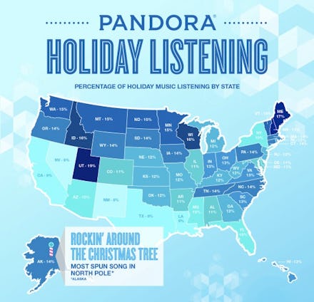 According to statistics released by Pandora, Utah streams more Christmas music than any other state in the union. Nineteen percent of Utah's Pandora users stream Christmas music throughout the holidays, well above average.