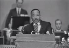 "I am mindful that only yesterday in Birmingham, Alabama, our children, crying out for brotherhood, were answered with fire hoses, snarling dogs and even death," said King. "I am mindful that only yesterday in Philadelphia, Mississippi, young people seeking to secure the right to vote were brutalized and murdered. And only yesterday, more than 40 houses of worship in the state of Mississippi alone were bombed or burned because they offered a sanctuary to those who would not accept segregation. I am mindful that debilitating and grinding poverty afflicts my people and chains them to the lowest rung of the economic ladder."