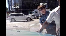 Whitlach pulls over in front of Wingate, who is standing at a crosswalk with his golf club hanging at his side, and asks him to put his club down. She clarifies "your golf club" to Wingate, who is hard of hearing.