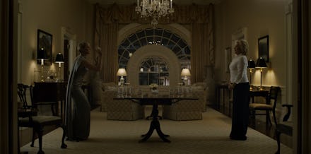 The second and third episodes of House of Cards' third season continue the trend we first spotted in the premiere: Frank is still struggling with the Sisyphean task of winning back public (and private) support for his policy agenda, and Claire is still showing a level of political facility that makes her presidential husband look downright Carteresque by comparison. The Underwood marriage is a partnership of equals, united as much by their complimentary ability to further one another's goals as by love.