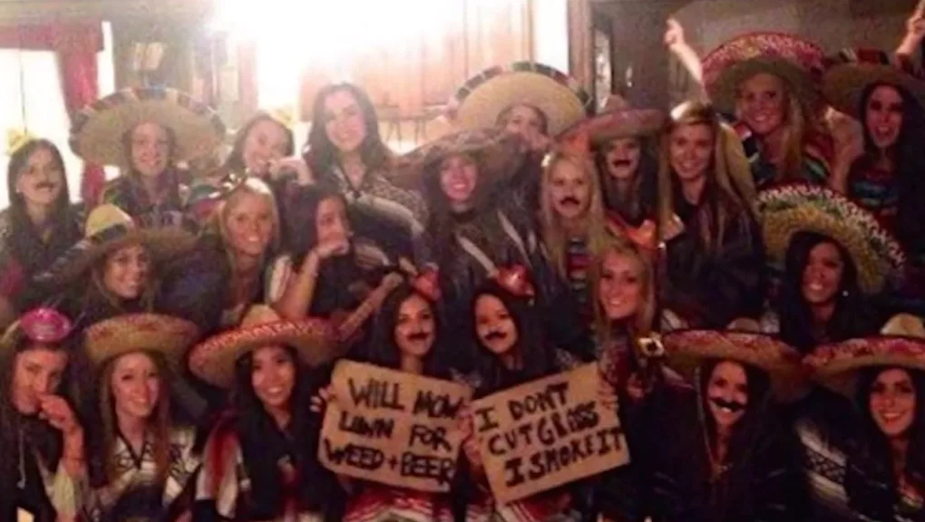 A leaked photo from this December 2012 party at Penn State featured with a picture of Chi Omega sisters posing with sombreros, mustaches and ponchos, holding up cardboard signs with the messages "Will mow lawn for weed + beer" and "I don't cut grass, I smoke it." The chapter was eventually shut down by its national organization in early 2014.