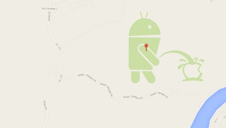 That's right. That is indeed an Android bot relieving himself all over an Apple logo. The quirky feature can be found by visiting these coordinates on Google Maps, a spot near Rawalpindi, a city in Pakistan.