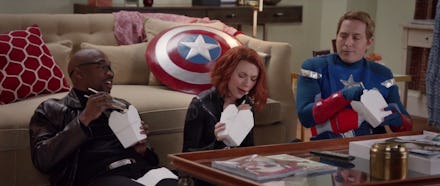 Nick Fury and Captain America make appearances as her gossipy pals, shown eating unhealthy food with her: