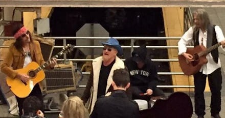 U2 is full of surprises lately. On Monday, the legendary band took over a New York subway platform for a surprise performance. Disguised as just your everyday buskers, Bono donned a blonde goatee and blue cowboy hat, while Edge wore a flowing wig with a bandana. But it didn't take long before they lost the disguises and attracted a sizable crowd who caught the performance on their phones.