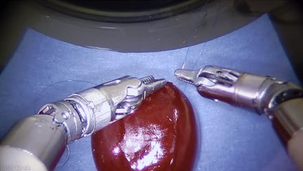 With the grace of a windup toy ballerina, a robot sutures a wound, slowly and deliberately stitching a piece of skin back over the exposed flesh. It uses tiny metal clamps to hold the skin and thread in place. Finally, it ties a knot at one end, and a scissor-equipped arm cuts the line, completing the job.