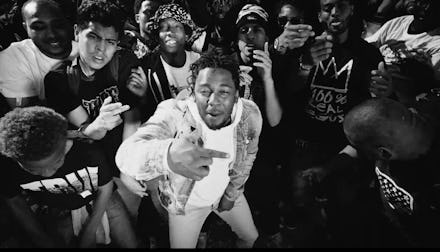 But all this horror quickly dissipates into an unreleased instrumental and verse where Kendrick asserts his mission to flip the scenes outlined above. He shows what that will look like: The camera pans out, and four white police officers carry his car on their shoulders while the whole TDE crew rocks out.
