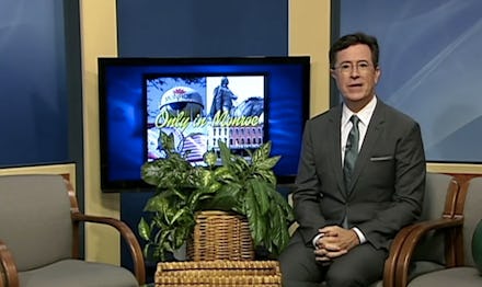 In a bizarre video uploaded to the Late Show's official YouTube account (and first reported by the Verge), Colbert appears to guest host a public access cable show in Monroe, Michigan. The show, Only in Monroe, is actually real, as are the hosts he interviews in the video. But the strangest bit of all involves an interview with Michigan's own Marshall Mathers — also known as Eminem.