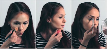 What it takes: That ideal is behind the biggest trend in YouTube makeup tutorials today: contouring. A game of light and shadows, the goal of contouring is to achieve a heart-shaped face through strategically placed makeup. Using a how-to video by Kandee Johnson, I layered darker colors around the edges of my forehead, hollows of your cheekbones, jawline and the sides of my nose. The lighter colors went on my forehead, under my eyes and the bridge of my nose. Then blend, baby, blend!