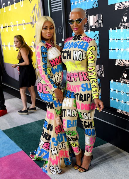 Models Amber Rose and Blac Chyna came to the Microsoft Theater in Los Angeles Sunday night in body suits covered in misogynist slurs like "whore," "gold digger," "bitch" and "slut." They were accompanied by two friends wearing black and white outfits decorated with the anti-gay slur, "faggot."