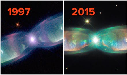 In late August, Hubble sent back an image of the Twin Jet Nebula, calling it a "cosmic butterfly" (its real name is PN M2-9). It looks like a cell dividing or two fists smashing into lightning in some disbelief-suspending kung-fu movie. What we're really seeing are expanding shells of gas. It's a glimpse of an old star staring its demise in the face.