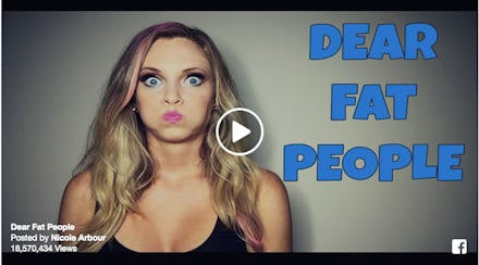 YouTube star and comedian Nicole Arbour posted a video lambasting fat people, which amassed more than 18 million views. In it, she likens overweight people to "Frankenstein" and "zombies" and says society should "shame people who have bad habits until they fucking stop."