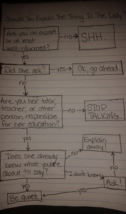 A day after a man explained the concept of ascending and descending street numbers to her, a friend told Armageddon she also experienced an "unsolicited and uninformed explanation being foisted upon her," the writer told the Daily Dot on Monday. These experiences inspired the writer to create a flowchart she titled "Should You Explain the Thing to the Lady?"