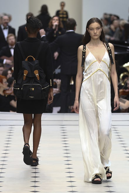 Backpacks have been back and brewing as a hot item for more than a year. Now, luxury designers are officially on board. On Monday, Burberry's runway show at London Fashion Week included a new line of backpacks (which they're calling "rucksacks"). The backpacks, adorned with monograms, were paired seamlessly and without explanation with short cocktail dresses, swingy skirts and silk gowns.