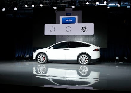 "This is a real button," Musk told his audience, that elevates air quality to "the levels of a hospital room," according to the Verge. The"medical grade" high-efficiency particulate air filter eliminates pollen, viruses and pollution from air entering the Model X cabin, according to Tesla. "We're trying to be a leader in apocalyptic defense scenarios," he added.