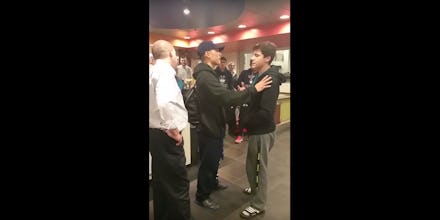 "Your job is a fucking joke," the disorderly patron says, dropping other insults like "fucking idiot," "fag" and "retard." When other cafeteria employees attempt to intervene, he insults them too. Eventually, the man shoves the manager, at which point he is tackled by the manager and another employee who says, "I told you! You don't touch my boss."