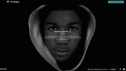 The streaming service asks permission to access a user's built-in camera in order to ensure their eyes remain on the screen at all times. Once the technology identifies a listener's face and eyes, the song begins with an image of 17-year-old Trayvon Martin, who was shot and killed by Florida neighborhood watch volunteer George Zimmerman in 2012.