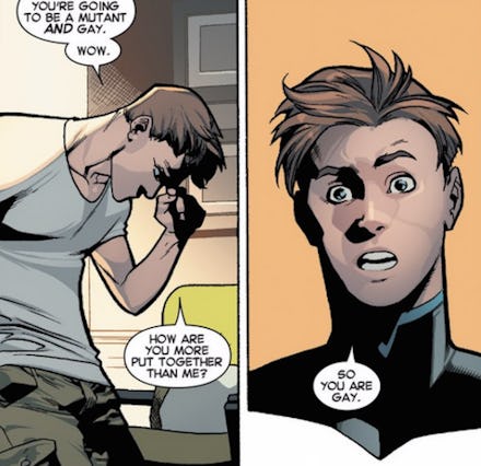 "I'm gay, it turns out," Iceman says in the comic. "So that means you are too. Right?" According to Rolling Stone, Iceman originally began accepting his sexuality in April's All New X-Men #40, when he supposed he may be bisexual, and a mind-reader told him, "I think you're more ... full gay."