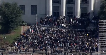According to Fusion, students staged a walkout of classes on Thursday while chanting "Black Lives Matter." In the library, near the scene of the discoveries, students took turns venting on a megaphone.