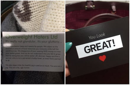 Bethany Rutter, a plus-size journalist who runs the blog Arched Eyebrow, decided to take the concept behind the fat-shaming card and turn it into an empowering message. On Monday, she tweeted out a plan: to print out cards saying "You look great today!" and distribute them on the tube.