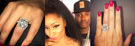 Minaj showed off her first diamond ring on Instagram while on set of their music video, "All Eyes On You."