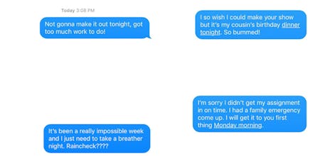In the era of texting and iMessage, it's never been easier to flake on preexisting social obligations. Quickly type up an excuse (any excuse will do!), ditch whatever work party or coffee meeting you felt obligated to go to, and you and Netflix can spend a relaxing night in together.