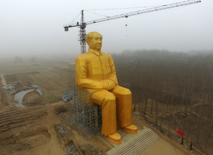 Local businessmen and villagers chipped in a total of almost 3 million yuan, or $460,000, to build a 120-foot tall Mao in Henan Province, the site of the Great Chinese Famine of the 1950s, according to the BBC. The gold-painted statue constructed from steel and cement sits amid miles of farmland with a spare head sitting beside it. Because sometimes even the greatest Communist, revolutionary leaders need one of those.