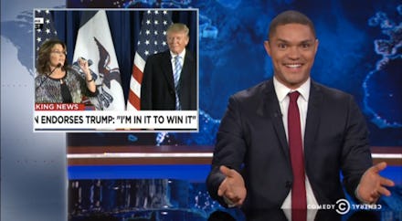 On Wednseday, Daily Show host Trevor Noah threw in his two cents to the commentary surrounding former Alaska governor Sarah Palin's endorsement of 2016 Republican presidential candidate Donald Trump.