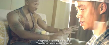 It turns out this was exactly the aesthetic its creators were going for. There's no actual film to accompany it. That trailer (banished from YouTube thanks to a copyright claim, but floating around other places) is apparently the first offering in a much larger campaign being run by Tsalta Baptiste, the actor who plays Tupac, to introduce Chinese audiences to authentic American hip-hop culture and to get American hip-hop thinking about its global status.