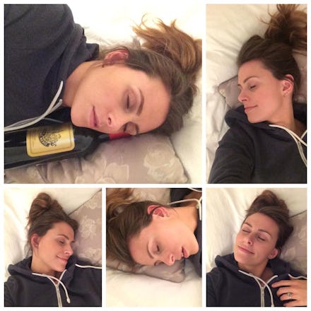 "I was nominated by myself to post five pictures that make me happy to be a non-mother," Taylor wrote, posting a photo of herself blissfully curled up next to a bottle of red wine. "Such special memories."