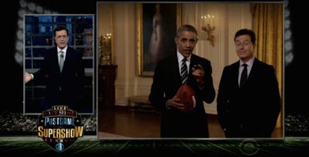 After fumbling through a vague recap of the NFL extravaganza — and getting called out on it by Colbert — Obama's second admission follows: