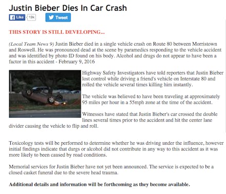 And yet the internet still takes the bait. On Jan. 8, 2014, the site appears to have been responsible for the circulation of a contentious tweet that left Beliebers in emotional shambles. "R.I.P. Justin Bieber, died crashing his Ferrari going 125 miles per hour. He is too young to go," it read. The car and its speed were new, but the basic premise remained the same.