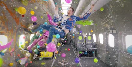 The band soars throughout the cabin, accompanied by two extraordinarily flexible flight attendants. They play around with props, breaking open piñatas and paint balloons, whipping computers and tablets through the air each other. At one point, they release a suitcase full of bouncy balls, which careen around in the cabin like bubbles in soda.
