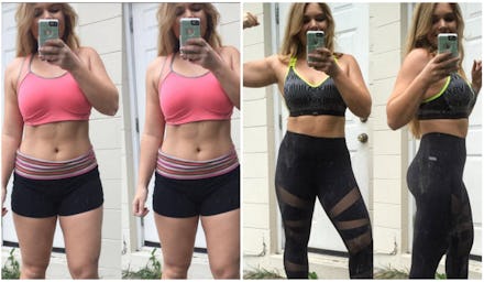 In the left photo, Jess has a round belly, thighs that touch and thick legs. In the right image, Jess has abs and muscular thighs. "These pics were taken [a] second apart this morning," she wrote.