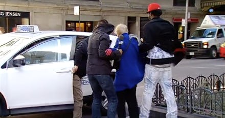 Miranda grabs onto the woman and signals to a passerby who takes her other arm and the two escort her to a cab. It's the ultimate show of teamwork and Boy Scout-ian altruism, but of the 11 million Facebook users who watched the video and the nearly 20,000 who commented, many only came away with one thing: the helpful passerby's low-riding pants.