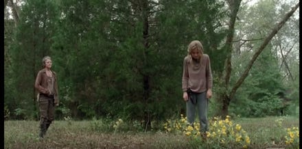 "Look at the flowers, Lizzie." Carol (Melissa McBride) arguably has the biggest transformation of any character in the series. She begins as the victim of domestic abuse from her now-deceased husband, and becomes one of the group's most lethal weapons. After losing her daughter Sophia (Madison Lintz) in season two, Carol essentially adopts two girls, Mika (Kyla Kenedy) and Lizzie (Brighton Sharbino), after their father is killed.