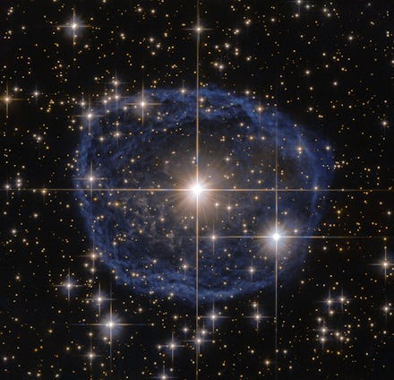 You can see the star in the center of the image below. The shimmering blue bubble around the star is called a Wolf-Rayet nebula, which forms when stellar winds whip up clouds of dust, hydrogen and helium into ring-shaped clumps.