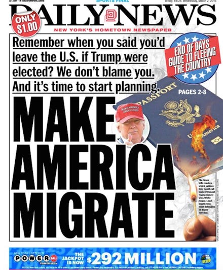 In the tabloid's signature style, "Make America Migrate" splashed across the cover in big black letters , a riff on Trump's ubiquitous campaign slogan. The cover also displayed a burning passport.