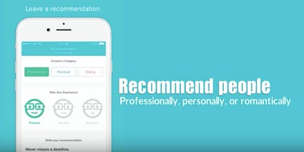 The app allows users to rate other users — strangers, exes, co-workers, neighbors — in three categories: professional, personal and dating. The scale is "positive, neutral and negative" and offers a space to write a custom "recommendation." The app drills home "Your character is your currency."