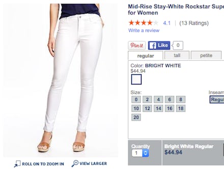 The stay-white skinny jeans are available from Old Navy in sizes 0 through 20.