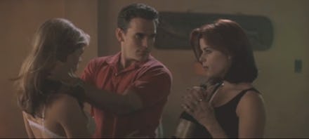 While we typically assume that only straight dudes fantasize about being in the middle of a lady sandwich, previous studies have supported the idea that women are into them as well. According to a 2004 survey, for instance, 21% of sexually active American men and women had fantasized about having a threeway, while Pornhub Insights listed "threesome" as the site's 13th most popular overall search term in 2015.