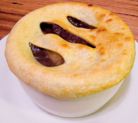 For the "pie" part, you can adjust the recipe by cheating and buying premade puff pastry. All you'll need is an oven-safe dish filled with the meat and onion mixture. Cover the top with the puff pastry, make sure it covers the pan completely. Crimp the edges with your fingers and use an egg wash to brush on top of the pastry to help create a golden crust. Bake everything for 30 to 40 minutes until golden brown and puffed.