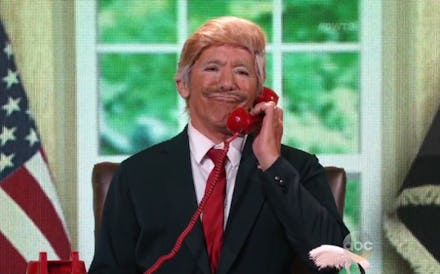 You have to give Geraldo Rivera credit: He was trying to make dancing great again. Unfortunately, the TV host couldn't get the support of the judges on Dancing With the Stars behind his attempt at a Donald Trump impression with a Latin twist. Imitating the GOP frontrunner for the contest's Latin Night, Rivera revealed that he wanted to do a Trump parody because "I'm a Latino — that is one thing Trump is not."