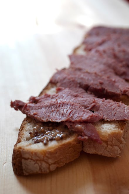 — Hastily apply mustard to one slice of bread. Haphazard application is fine. Stack corned beef on top of that and top with remaining bread slice.