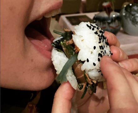 "Use a fork or chopsticks to eat it!" Melbourne wrote in the caption. "This burger can be messy to eat, so if you aren't up for the challenge, simply enjoy this as a sushi bowl or a rice ball. Namaste."
