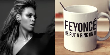 If you liked it, then you should have put a ring on it — and made sure that rock isn't a knockoff. That's what Beyoncé is telling Feyoncé after suing the site for "brazenly" selling shirts, sweatshirts and tank tops nearly identical to her own merch, but with an F, Reuters reported Tuesday. The site features pictures of happy couples excitedly showing off engagement rings, as well as a mug for sale which reads: "Feyoncé. He put a ring on it."