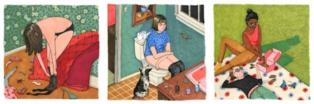 A new series of illustrations from Arkansas-based artist Sally Nixon wants to show women as they really are, in all their pizza-eating, boxed wine-swilling, romcom-DVD-renting splendor. Her drawings depict women engaging in everyday activities, as if nobody on social media is watching.